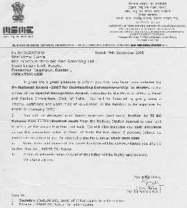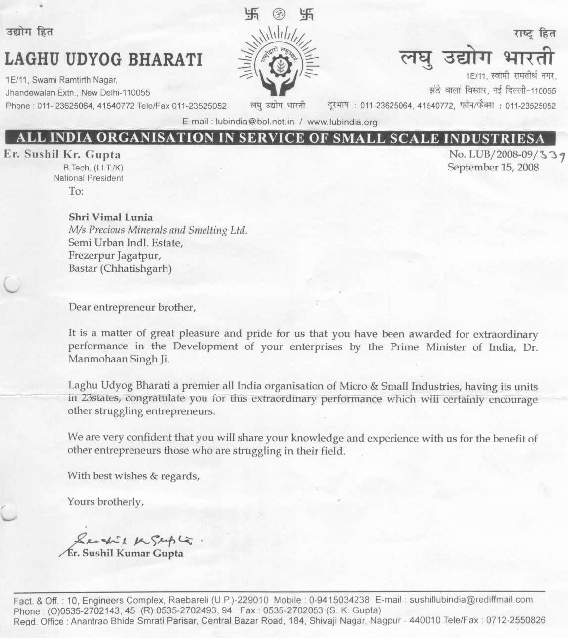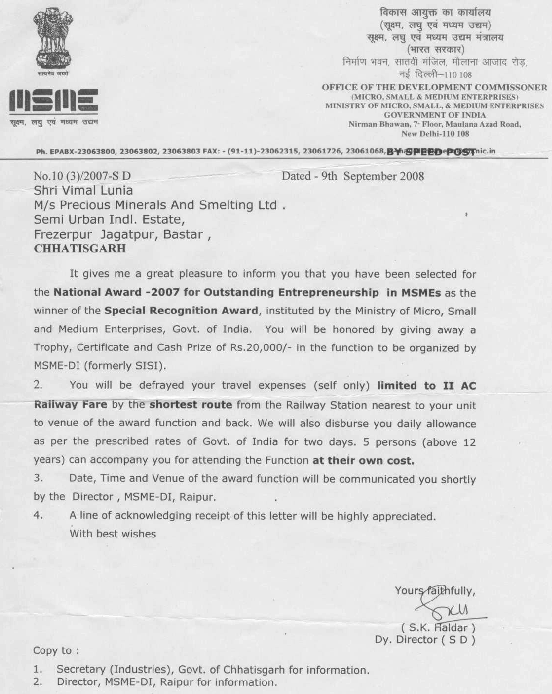 The PMSL for its contribution & developments in the field of Mining and Mineral Industry was awarded the Prestigious "NATIONAL AWARD-2007" "SPECIAL RECOGNITION AWARD" for outstanding Entrepreneurship in MSME's by the Ministry of Micro, Small & Medium Enterprises (MSME), Government of India.
